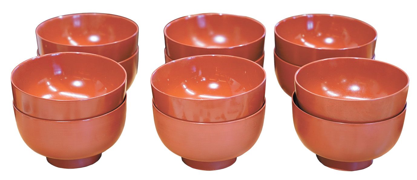 浄法寺漆の器は、国産の木地に漆を塗って研いでを6、7回繰り返す、塗り重ねの手法です。塗り重ねることで木の器に強度を持たせます。塗師が最初に漆を器に染みこませてから、完成までは3カ月ほどかかります。
